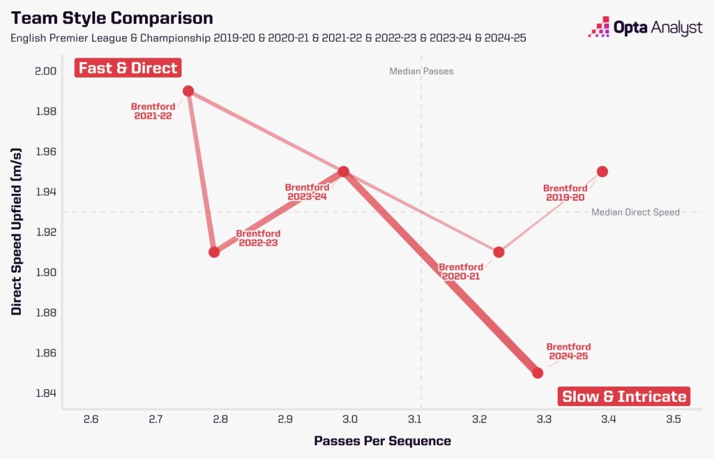 De-a lungul sezoanelor, Brentford s-a transformat continuu sub comanda lui Thomas Frank. Dacă au promovat din Championship cu un joc bazat pe posesie și pase, în primele două sezoane din Premier League au adoptat un stil mai defensiv, cu multe pase lungi și cinci fundași. În ultimii doi ani, însă, echipa a devenit mai ofensivă, a trecut la patru apărători, a căutat posesia și a început să iasă din apărare prin pase rapide.