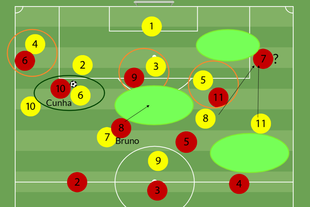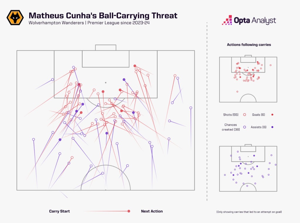 Cunha a fost cel mai periculos om al lui United de duminică – a coborât constant între liniile lui Arsenal pentru a primi mingea și a reușit să avanseze de 13 ori cu mingea la picior în poziții din care să creeze ocazii de gol.