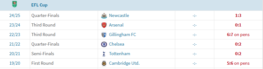 Brentford nu a reușit vreo performanță notabilă în FA Cup sau Carabao sub Thomas Frank. Dimpotrivă, echipa a fost eliminată inclusiv de formații din ligi inferioare, precum Gillingham sau Plymouth. Sursa: Transfermarkt