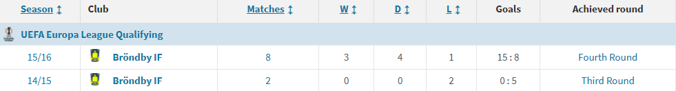 Antrenată de Thomas Frank, Brondby nu a reușit niciodată să ajungă în grupele unei competiții europene. Sursa: Transfermarkt.