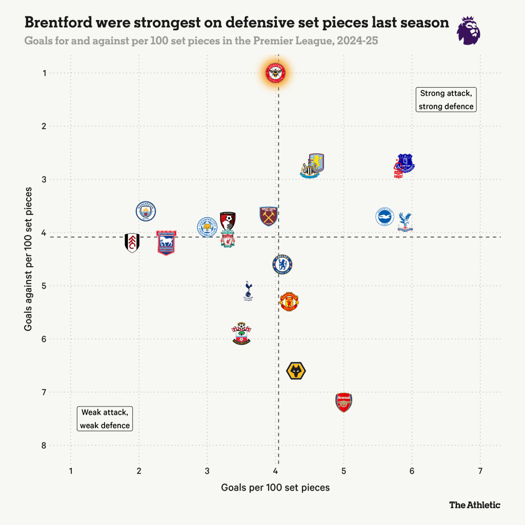 Brentford are de departe cea mai bună apărare la fazele fixe din sezonul trecut. Un aspect important pentru Spurs, care a suferit enorm la acest capitol sub Ange Postecoglou. Sursa: The Athletic