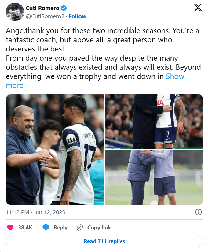 La o oră după ce Thomas Frank a fost anunțat oficial ca noul manager al clubului, Cristian Romero publica un mesaj de adio către fostul antrenor – Ange Postecoglou.