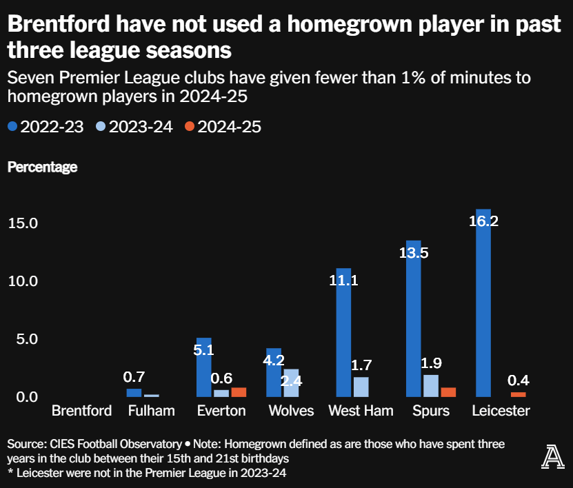 Brentford nu a folosit niciun jucător homegrown în ultimele trei sezoane. Sursa: The Athletic.
