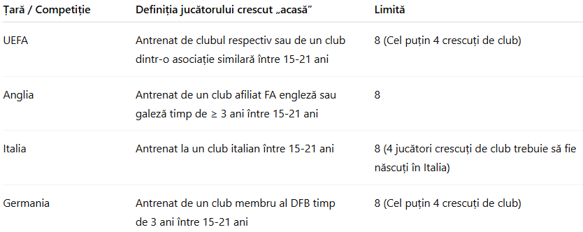 Cum se raportează diferite competiții la integrarea fotbaliștilor interni în lotul de jucători.